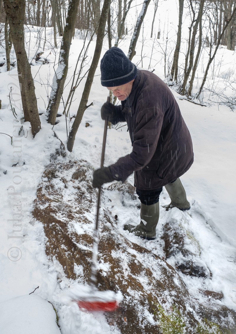 Kaivantoja on kymmeniä ja työ tapahtuu lapiopelillä. Pentti on silmin- nähden innostunut, kun hän kertoo uusista löydöksistään. Lumen ja jään peittämiä kallioita hän putsaa katuharjalla näkyviin. "Tuossa on neliön muotoinen alue, mitähän siinäkin on tehty?" Toisessa paikassa on asutuksen merkkejä, "kivet tuoksuvat noelle kun niitä nostelee".